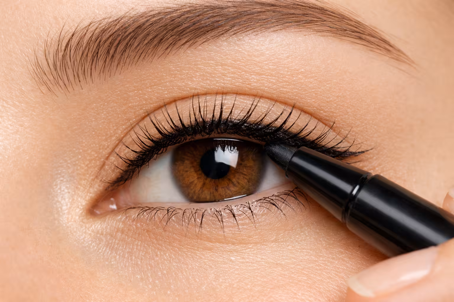 Applying nude eyeliner to the lower waterline can make the eyes appear larger and lashes more noticeable without mascara.